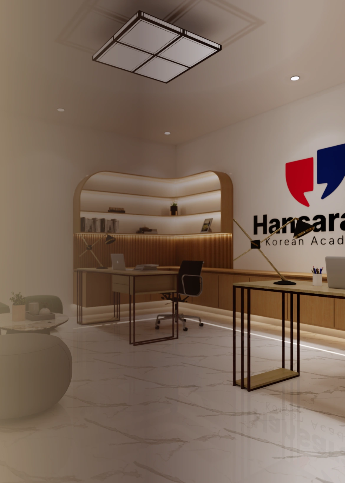 Ruang belajar dengan desain modern yang menonjolkan kesederhanaan dan keteraturan. Setiap elemen interior dirancang untuk mendukung suasana belajar yang fokus, nyaman, dan profesional.